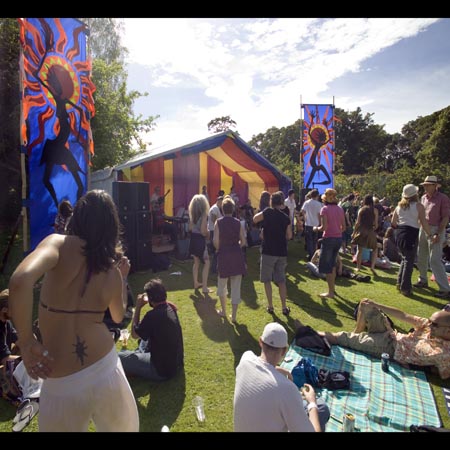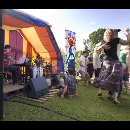 Bhundu Boy Rise Kagoma (guitar, centre) and Champion Doug Veitch (guitar, right), and band, on the Walled Garden stage.