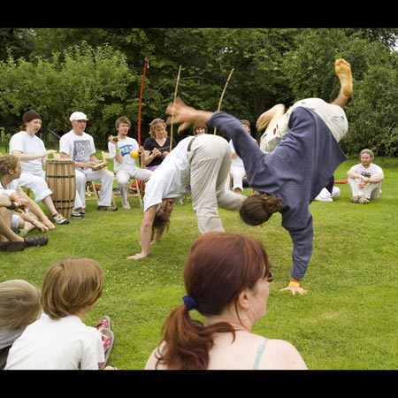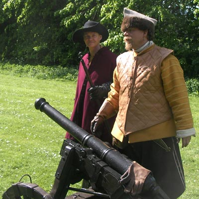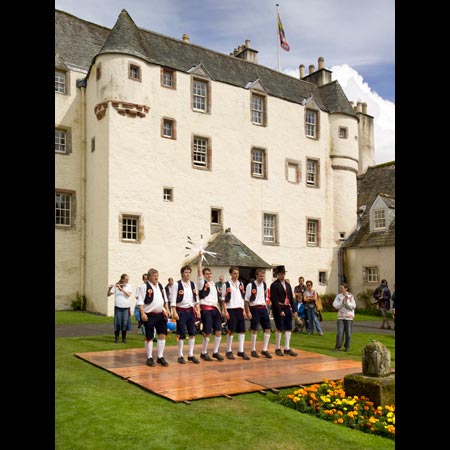 The wife of the African Chief, the African Chief, and his drummers - with Traquair House in the background.